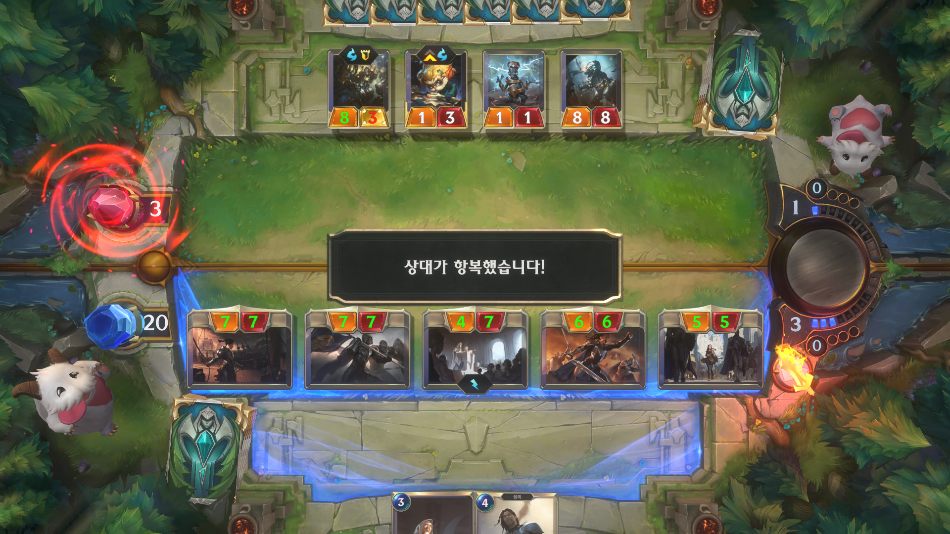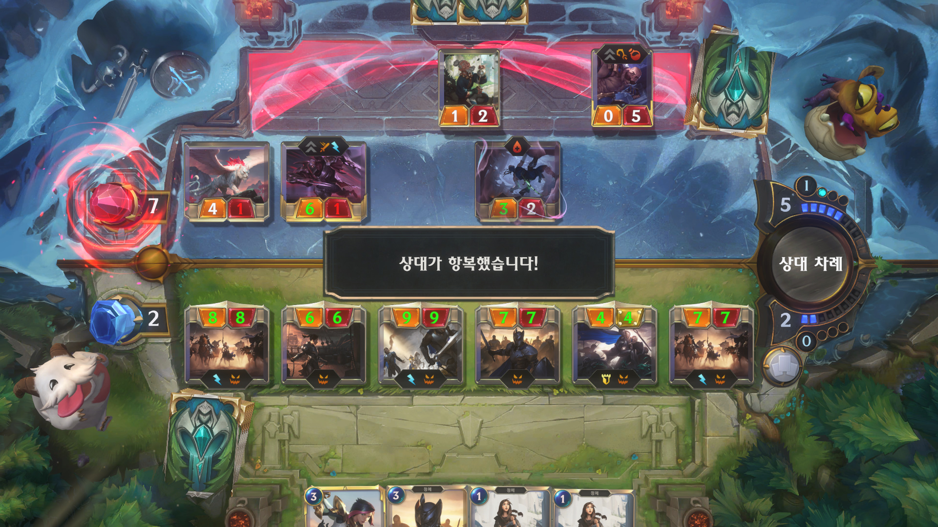 포착불가 티모가 죽어도 전장으로 안나온다던지, 프렐요드 그 누구더라.. 애쉬는 아닌데 라운드 시작할때마다 아군 최고공격력 가진애를 얼리는애.. 걔도 엄청 짜증이죠. 그리고 군도중에서 0/3인데 아군이 죽을때마다 넥서스에 짤짤이 딜 들어가는 특성가진.. 다 이름은 모르겠네요. 아무튼 그런애들 도전자로 끄집어줘서 때려줘야 되는데 제가 쓰는덱에 도전자가 은빛날개밖에 없으므로 강제적으로 결투로 마무리를 해줍니다.
