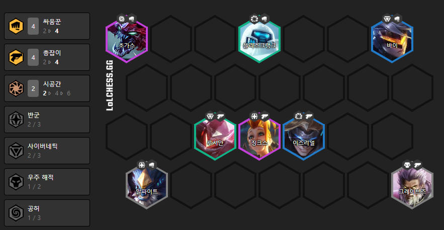 특히나 쌈총이 겹칠경우, 그리고 재수없게 상대방이 패가 훨씬 더 잘떴을경우 더더욱 싸움꾼에 집중해야합니다. 대개 쌈총을 하는 사람들은 3성작을 총잡이 위주로 하니까요. 루시안, 이즈리얼 위주의 3성작이기 때문에 뭔가 겹친다, 뭔가 나만 개말린다싶으면 블츠,바이 3성으로 활로를 모색해야 합니다.