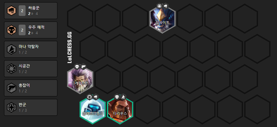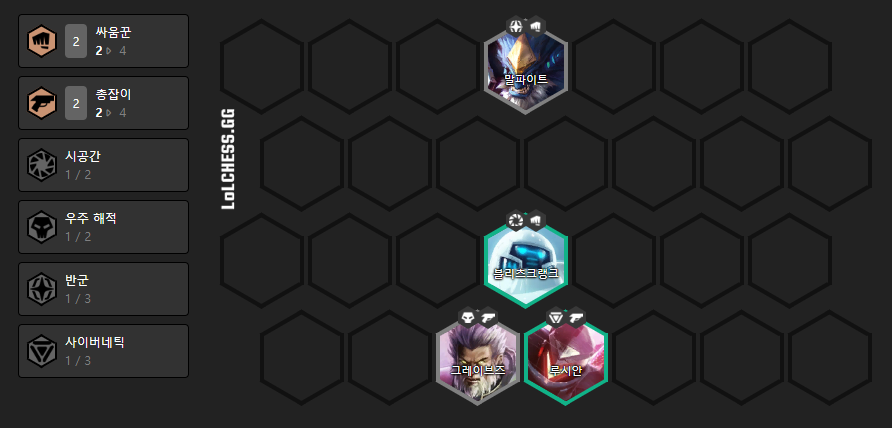 제일 좋은건 역시나 2쌈2총이 되었을때 입니다. 블츠를 3줄에 놓는 이유는 총잡이들이 일점사를 하기 위함인데, 다들 아시다시피 블츠를 가장 구석에 두면 총잡이 들이 앞으로 가다가 블츠가 쿵~하고 에어본 띄우면 그때 다시 돌아와서 같이 딜을 하죠? 그럼 왔다갔다 할때 딜로스가 발생하기 때문에 예방차원에서 이렇게 합니다. 만약 그브가 이미 2성이고 그판에 다른사람도 블츠를 가는 사람이 있다면 블츠를 구석에 두는것이 좋겠지요. 그리고 배치상 끌어온애가 2열에 위치하기 때문에 1열에 있는 말파도 같이 딜해줄수있는 환경을 만들어줄 수 있어요.
