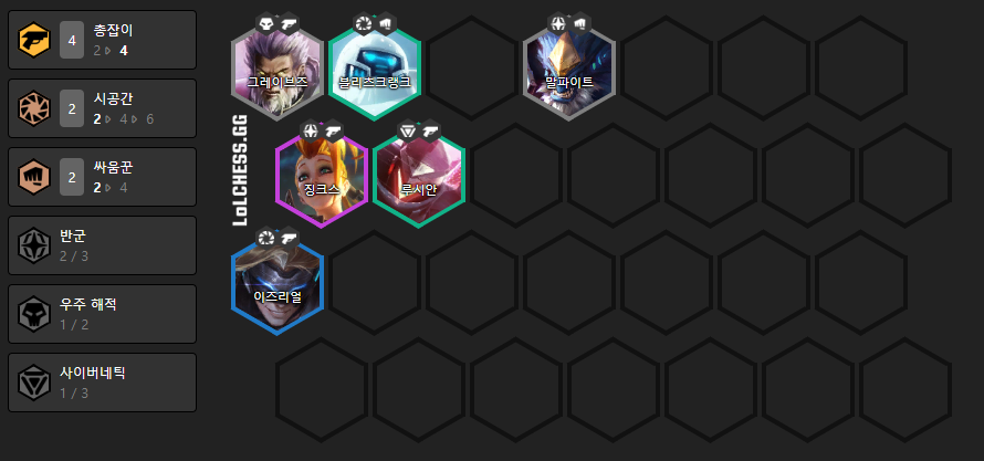이즈리얼이 총잡이면서 시공간이기 때문에 3총잡에서 4총잡으로 넘어가는게 이상적이지만 그게 안된다면 3싸움꾼으로 가면서 이즈 넣고 시공간 받아주거나, 반대로 2시공을 받고 3총잡상태에서 앞라인을 견고하게 하기위해 바이 넣고 3싸움꾼으로 하는것도 좋습니다.