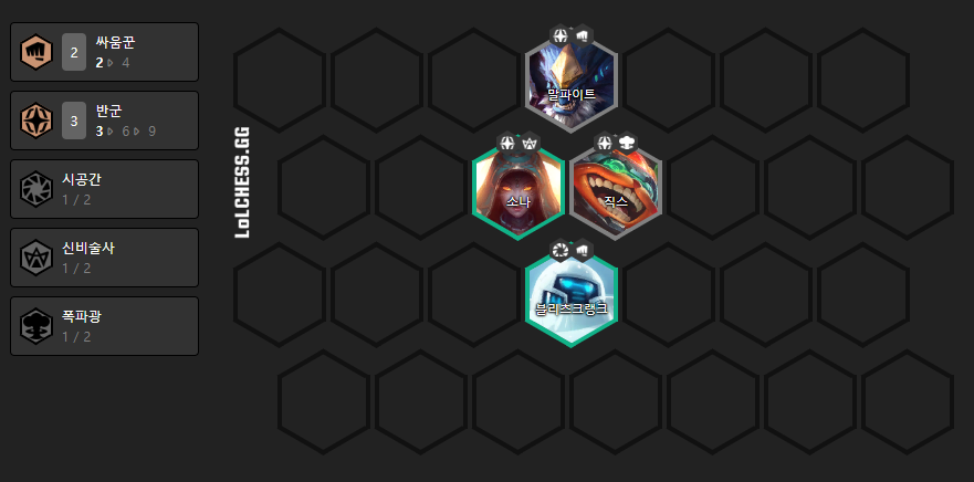 당연히 총잡이가 하나도 안나올 수 있습니다. 이럴땐 일단 3반군으로 가줍니다. 다른 조합들보다 파괴력은 약하지만 반군이라는 특성과 소나의 힐을 통한 유지력으로 버티는 조합입니다. 그리고 직스가 최대마나가 적기때문에 비교적 스킬을 빨리 굴릴 수 있는게 그나마 장점인데 그리 많이 추천하지는 않는 조합이긴 합니다. 정 안되면 가는건데 만약 이런조합조차도 나오지 않게 되면 그때는 그냥 1코짜리 페어 나오는거 집어주시다가 2성 붙는애들로 써서 버텨야합니다. 어쩌겠어요 돌거북은 잡아야 하잖아요. 그리고 현실적으로 1코 2성 대충 붙는거 먼저 쓰는게 현실에서 제일 많이 보는 방법일거예요.ㅎㅎ