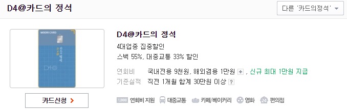 투썸플레이스 할인카드로 제일 많은 혜택은 D4@카드의 정석이예요. 이거는 투썸말고도 스타벅스, 커피빈,풀바셋이 자그마치 55% 할인이 되요. 게다가 희한하게 할인한도가 1년으로 퉁치지 않고 1~10월 11,000원 / 11~12월 22,000원으로 따로 구분되어 있어요. 간단히 요약해보자면,