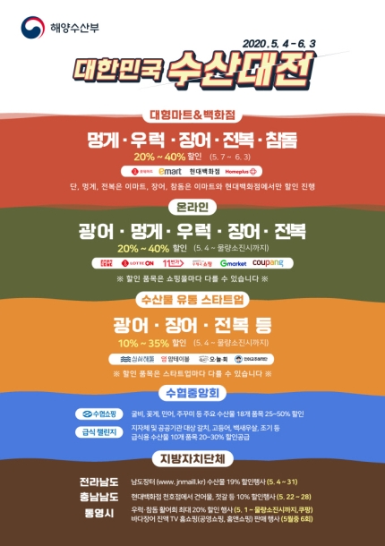 전혀 모르고 있다가 친구가 무슨 포스터 하나를 보내주더니 너네 마트에선 이거 언제하냐고 묻더군요. 자세히 보니 대한민국 수산대전이라는 행사를 정부차원에서 시행하는데 이유는 코로나로 인한 수산물 판매저하로 인한 판매활성화 방안이었네요. 우럭, 전복, 멍게, 장어 등등 여러가지 수산물들을 최대 50% 할인된 가격으로 산다고 하는데요. 근대 50%라는 말은 공지사항에 없어요. 따로 업체에서 50%씩 하기로 했나봅니다. 밑에 사진은 해양수산부에서 검색창에 대한민국 수산대전 검색하면 알림 카테고리에 나와요.