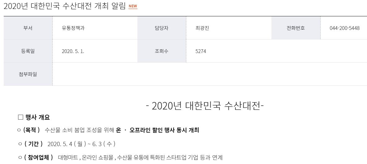 유통정책과에서 공시한 2020년 대한민국 수산대전 내용입니다. 엊그제 5월1일날 등록이 되었는데 벌써 조회수가 5274건이네요. 홍보를 되게 많이 했나봅니다. 사실 관공처 홈페이지에 뜨는 알림을 자주 확인해보는 사람은 거의 없자나요. 저도 마트직원이지만 이 내용은 오늘 친구통해서 알게되었는데 저희 매장도 하는군요. 행사기간은 5월4일부터 6월3일까지 굉장히 길게 진행이 되는데 그 안에 세부적으로 판매채널마다 일정이 다르기 때문에 어디서 무얼 언제살지 아래 표를 보고 결정하셔야해요.